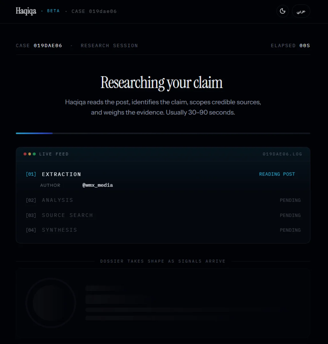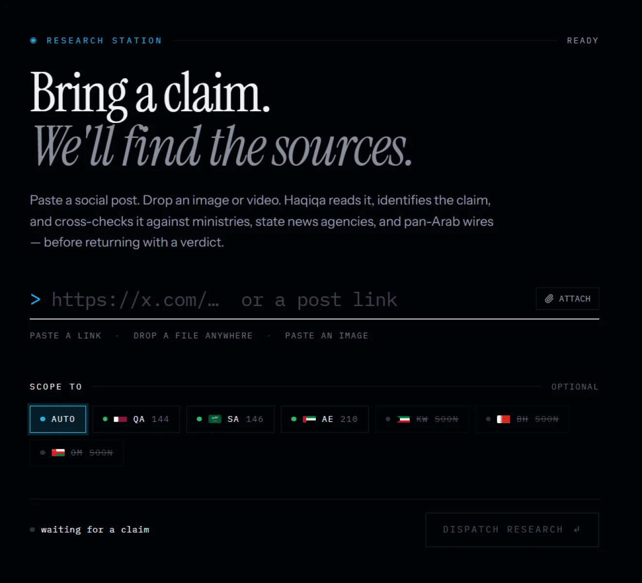 Haqiqa helps journalists, researchers, and everyday readers separate fact from fiction across the Arab digital landscape. The platform monitors major social networks and cross-references claims against a curated library of credible sources, delivering verified results in regional context.