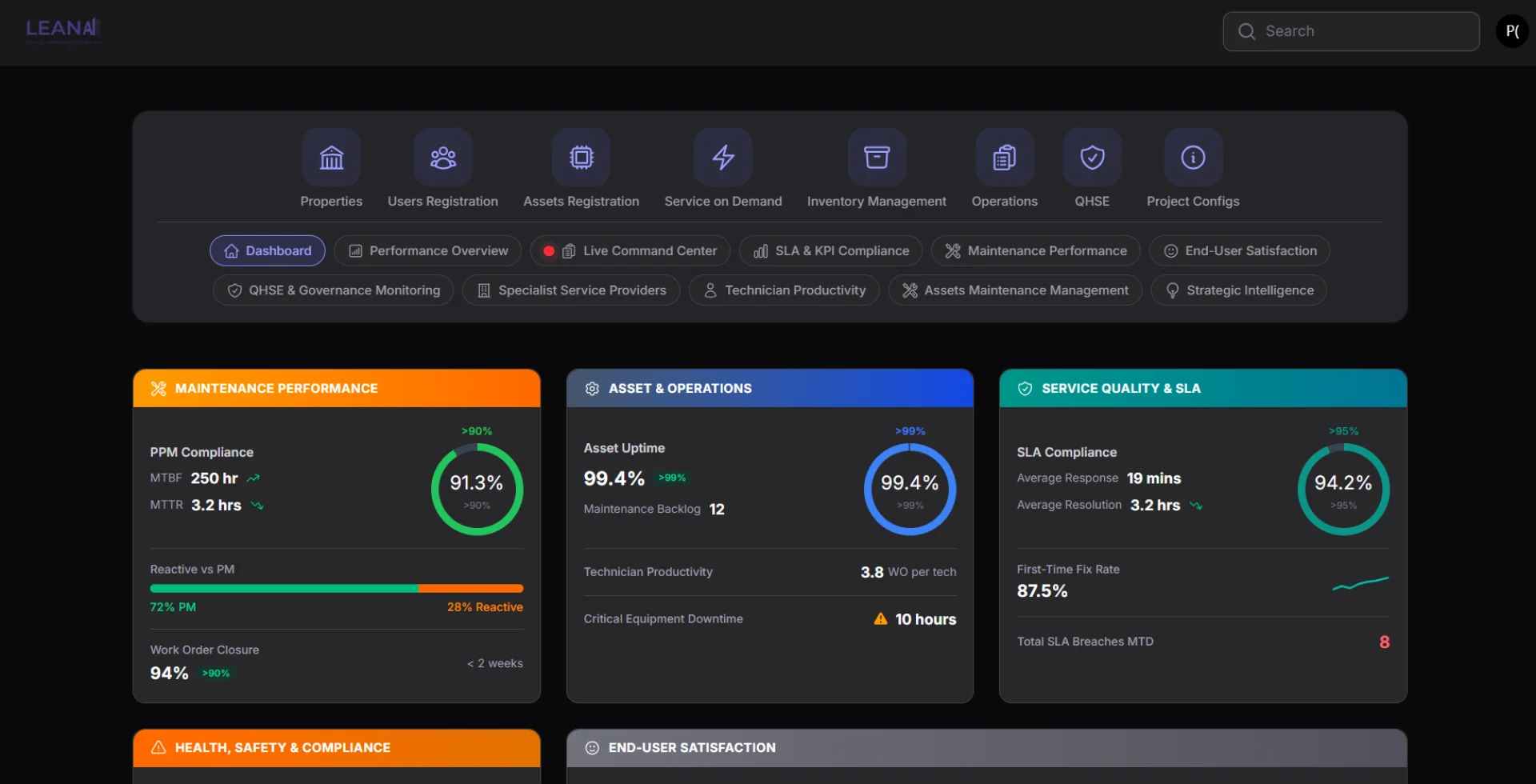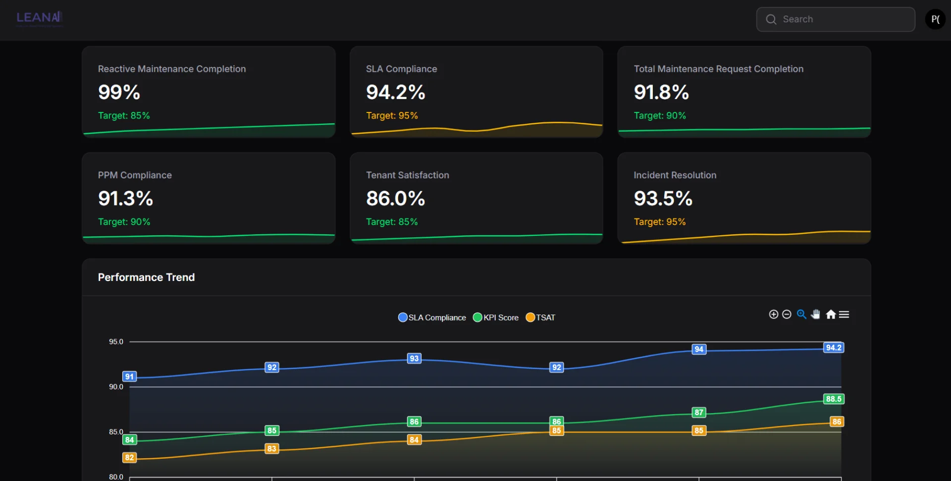 Lean AI CAFM replaces legacy CAFM tools, spreadsheets, and scattered email chains with a single intelligent platform. Work orders, approvals, and tenant requests happen inside WhatsApp, while leadership governs from real-time command dashboards. AI predicts SLA breaches, forecasts inventory, and scores service-provider performance.